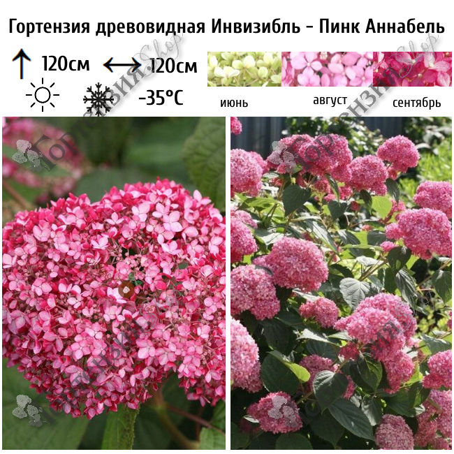 Предпочитает открытые места для посадки, но может выносить и полутень. Совершенно не выносит длительного застоя влаги. На зиму желательно мульчирование и легкое укрытие. Зимостойкий сорт, выдерживает–35° Соцветия  крупные (достигают 30 см), при этом стволы на столько толстые и прочные, что крупные шапки не заваливаются. Листья продолговатые с зазубренными краями 20 см в длину, окрашенные в зеленый цвет. Соцветия шаровидной формы, состоят из большого количества цветков.  Гортензия Пинк Аннабель цветёт дольше всех остальных древовидных гортензий. В отличие от остальных гортензий обладает идеально чистым красиво-ярко-розовым цветом.