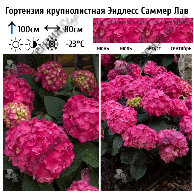Куст компактный, густой, к 10-ти годам высотой 100 см и диаметром 70 см. Цветки от малиново-красных до фиолетовых, в шаровидных соцветиях. Цветение обильное, длительное, в июне-сентябре. Цветёт на прошлогодних побегах и побегах текущего года. Побеги прочные, толстые, рубиново-красные. Место солнечное. Почва влажная, дренированная, слабокислая. В сильнокислой почве цвет изменится на пурпурно-синий. Идеально подходит для сада, террасы. Место солнечное или полутенистое. На зиму требует укрытия. Сорт "Летняя любовь" (Summer Love) изобилует бутонами интенсивного малиново-красного или темно-фиолетового цвета Гортензия обладает не только сказочной красотой, но и компактным внешним видом.