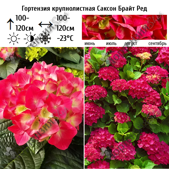 Гортензия крупнолистная 'Саксон Брайт Ред' (серия Saxon)  цветущий кустарник высотой до 100-120 см и шириной до 100-120 см. Листва глянцевая тёмно-зелёная, осенью красно-бордовая. Побеги крепкие прямостоящие. Цветёт обильно всё лето на прошлогодних побегах и побегах текущего года. Цветки эффектные, звездчатые. Соцветия диаметром до 15 см., красные. Цветение с июня по сентябрь. Подходит для одиночных и групповых посадок а также для выращивания в контейнере. На зиму требуется укрытие.