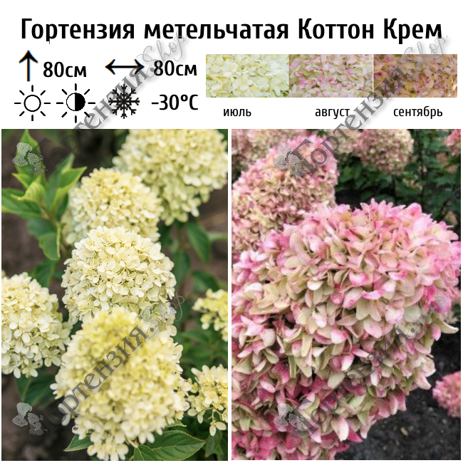 Компактная гортензия Коттон Крем (Cotton Cream) сложена практически идеально, достигает в высоту около 80–100 см. Крона гортензии плотная, густая, шаровидной формы, состоит из многочисленных разветвлённых побегов. Окрас варьируется в зависимости от периода фазы роста: при распускании бутонов он зеленоватый, в процессе развития культуры становится кремовым, а после цветения преобразуется в розоватый. Ссоцветия плотные стерильные, с кремовыми округлыми цветками.