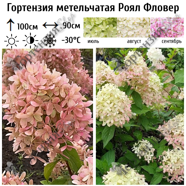 Гортензия метельчатая Роял Фловер - отличается продолжительным цветением и необычным окрасом лепестков. Он имеет пышные, крупные метелки ослепительно белого цвета. В конце цветения на чашелистиках появляется широкая ярко-розовая кайма, невероятно красивого оттенка, а серединка остается бело-зеленой.Растение обладает приятным ароматом и является медоносом. Долго сохраняет декоративность, несмотря ни на дождь, ни на жару. Невысокий кустарник с поверхностной, хорошо развитой корневой системой. Максимальный рост — 100 см, диаметр куста — 90 см.