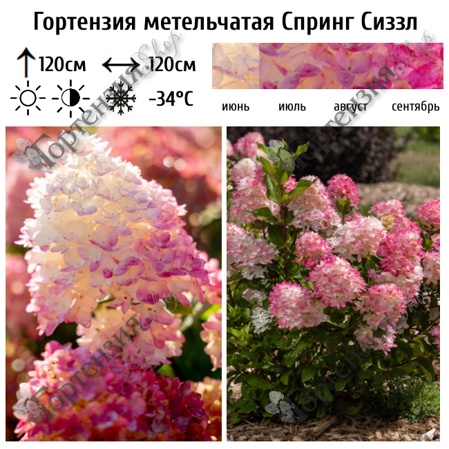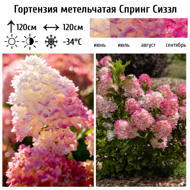 First Editions® представляет новинку: гортензия метельчатая Spring Sizzle (Спринг Сиззл )— одна из самых раннецветущих метельчатых гортензий. Она полностью расцветает к середине июня и приобретает насыщенный цвет на несколько недель раньше других метельчатых сортов. Цветение начинается  в июне с появления пышных сливочно-белых метелок, которые стремительно, словно по волшебству, меняют свой наряд. Сначала они подергиваются нежным розовым румянцем, а затем быстро приобретают глубокий ярко-красный цвет уже в июле. Уникальность сорта в том, что насыщенные красные оттенки проявляются даже в теплом климате. Цветки крупные, плотные конические метёлки длиной 20–30 см. Соцветия держатся на крепких стеблях, которые не поникают. Спринг Сиззл вырастает до 1,2–1,8 метра в высоту и 1,2–1,5 метра в ширину и идеально подходит для живых изгородей, групповых и одиночных посадок.
