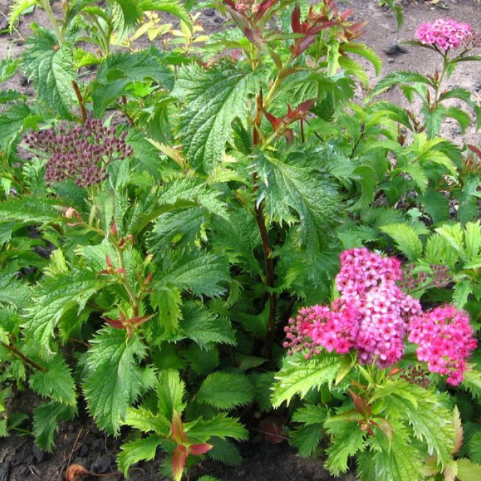 Спирея японская Криспа (Spiraea japonica Crispa) - невысокий кустарник с плотной,раскидистой кроной.Высота куста дорастает до 70 см, при ширине 80 см. Побеги прямостоячие, иногда изогнутые. Листья зубчатые, волнистые, темно-зелёные, осенью краснеют. Цветки - плоские зонтики, розово-лилового цвета. Появляются на концах прошлогодних побегов. Цветёт с июля до сентября. Для более продолжительного цветения рекомендуется удаление отцветших соцветий. Спирея лучше всего цветет на открытых, хорошо освещенных местах. В тени может терять интенсивность окраски листьев и густоту кроны.К почве нетребовательна. Зимостойка.