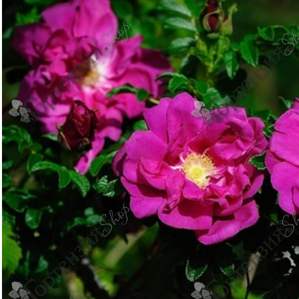 Кустарник с раскидистой, густой, ветвистой кроной высотой в среднем 0,8-1,2 м, в жарком климате может достигать до 1,5 м. Листья морщинистые, непарноперистые, зеленые. Бутоны пурпурно-малиновые, овальные, заостренные. Цветки чашевидные, темно-малиновые, полумахровые, с насыщенным ароматом, в каждом цветке 20-25 тонких лепестков с волнистыми краями и золотистые тычинки в центре, эффектно контрастирующие с малиновыми лепестками. Цветки в соцветиях по 5-8 шт Плоды крупные, округлые, ярко-красные, мясистые. Светолюбива, выносит легкое затенение. Зимостойкость высокая.
