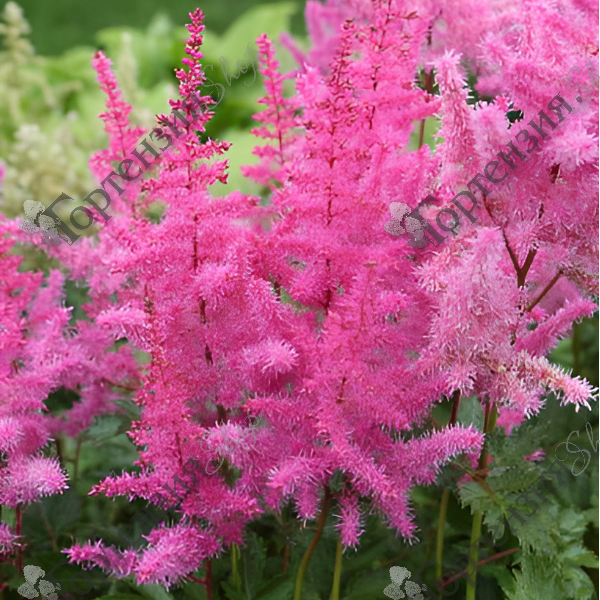 Астильба Арендса 'Глория Пурпурея цветки насыщенно-розовые, прицветники очень плотные и эффектные.Пушистые фиолетово-розовые соцветия высоко держатся на крепких стеблях . Красивая листва, распускаясь, приобретает бронзовый оттенок, а летом становится зеленой. Это самый яркий из розовых астильб. Считается одним из самых ранних сортов. Хорошо растёт в тени и переносит влажные почвы.