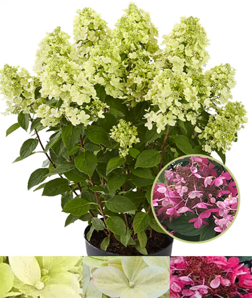 Метельчатая гортензия "Пандалус" – эксклюзивная серия Патио немецкой селекции PAN, отличается невысокой, компактной и пышной формой куста, высотой до 100 см, и диаметром до 80 см, рано зацветает и обильно цветет, неприхотлив в уходе. Цветки имеют выраженный приятный аромат, которым будет окутан ваш сад на протяжении всего периода цветения. Соцветия плотные, конусовидные, в начале цветения нежно-зелёного цвета, затем постепенно к осени становятся ярко-розовыми. На солнечном участке или в легкой полутени цветение будет пышнее и ярче. Ветви крепкие, прямостоячие. Цветет с июня и до заморозков. Зимостоек, неприхотлив. Прекрасно смотрится как бордюрное растение, так и очень декоративны в кашпо.